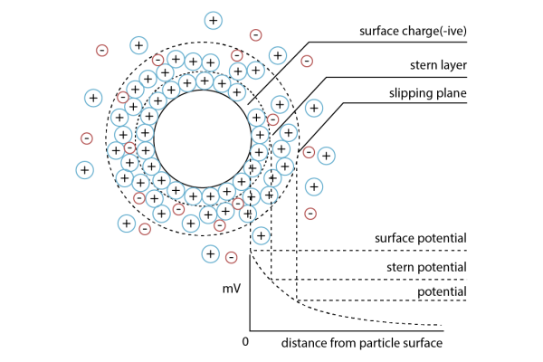 One of the important properties of nanobubbles is the electrical charges on the bubble surface which determines the interaction of nanobubbles and how they interact with other materials such as solid particles or oil droplets. The electrical potential of a particle in a colloidal system can be expressed by the Zeta-potential.